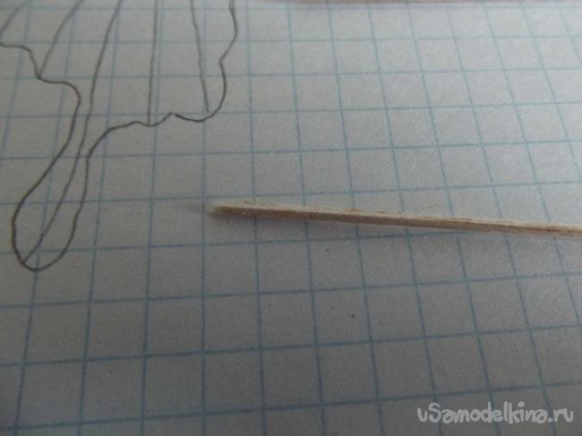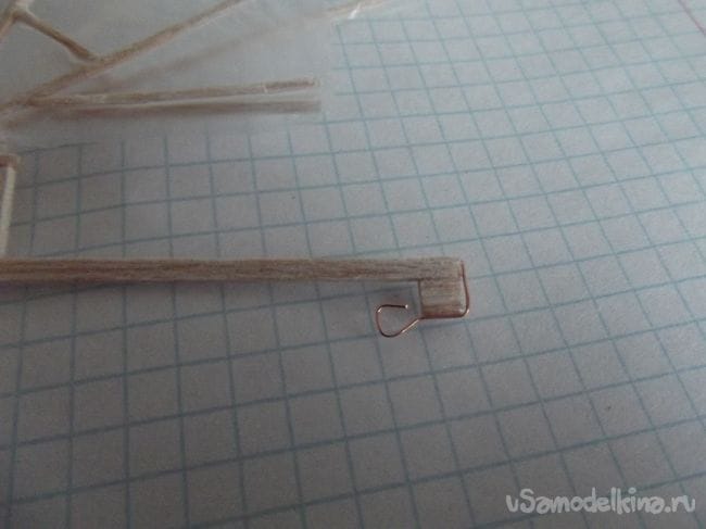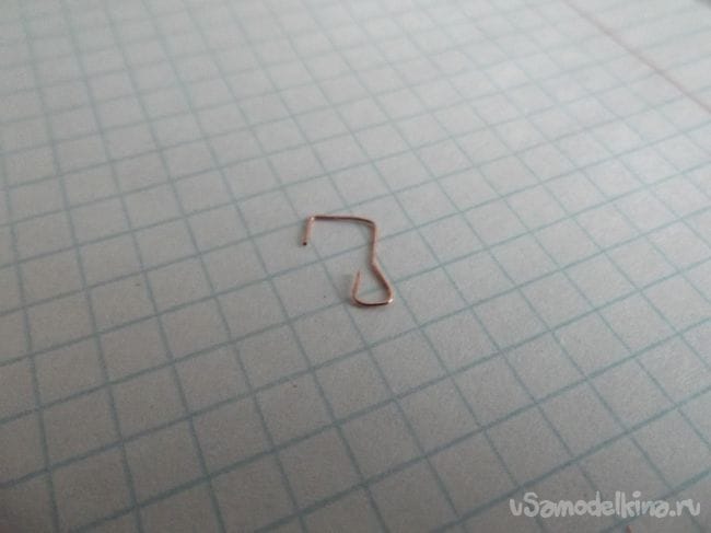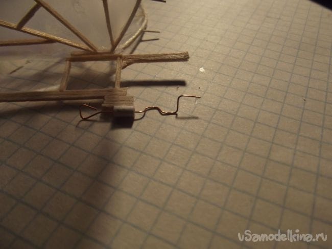 Затем я начал делать коленвал и крючок для резинки. Я долго не мог решить, из чего его сделать, но потом под руку мне попался кусок провода. Проволока внутри него была довольно прочная, и было принято решение делать коленвал с крючком из нее.
