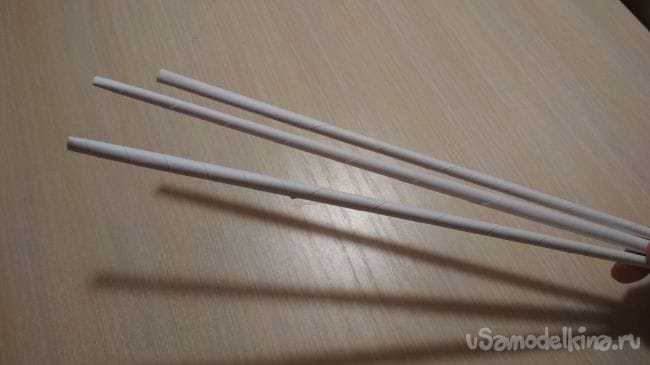 Затем берём ещё одну толстую трубочку и размечаем на ней 3 кусочка, два по 5-6 см, а оставшийся на 7-8 см.