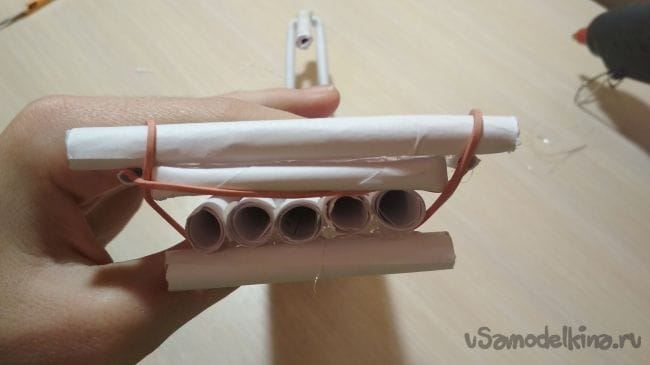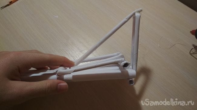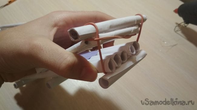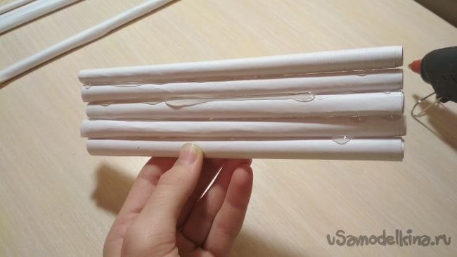 Склеиваем 5 толстых трубочек между собой так как показано на фото, формируя основание нашей конструкции: