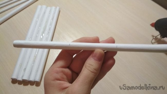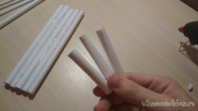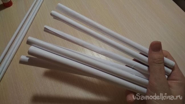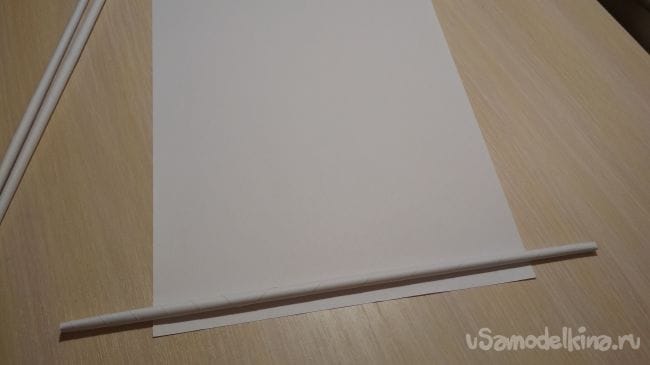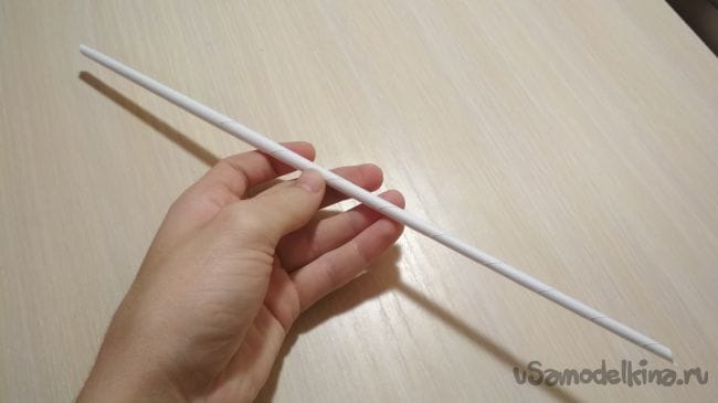 Берём ещё один лист бумаги, кладём на него тонкую трубочку и начинаем обматывать лист вокруг неё, делая тем самым толстую трубочку. Всего нам понадобится 8 таких трубочек: