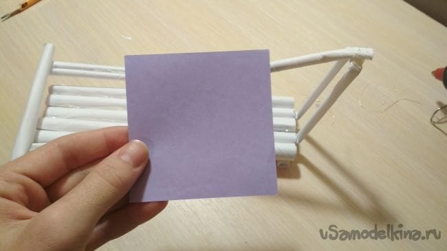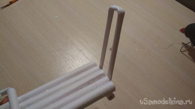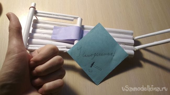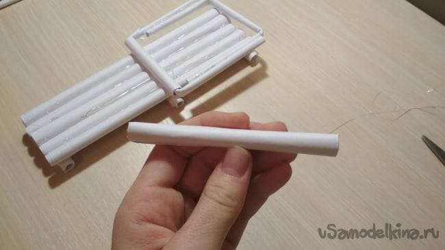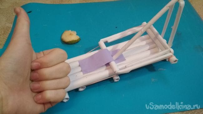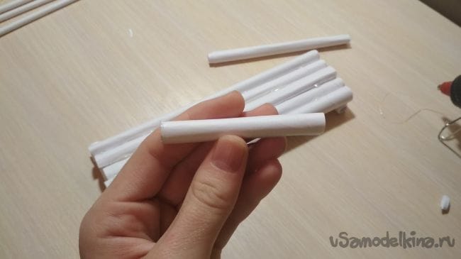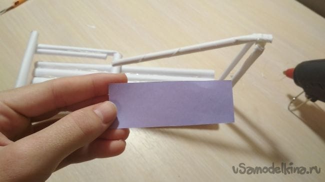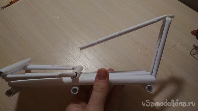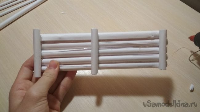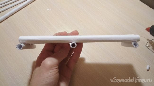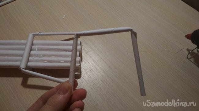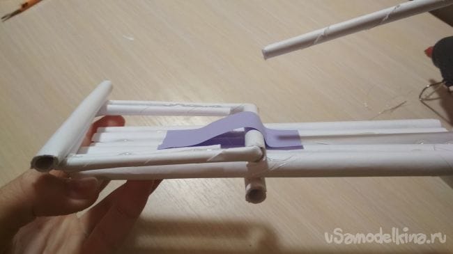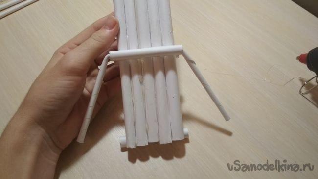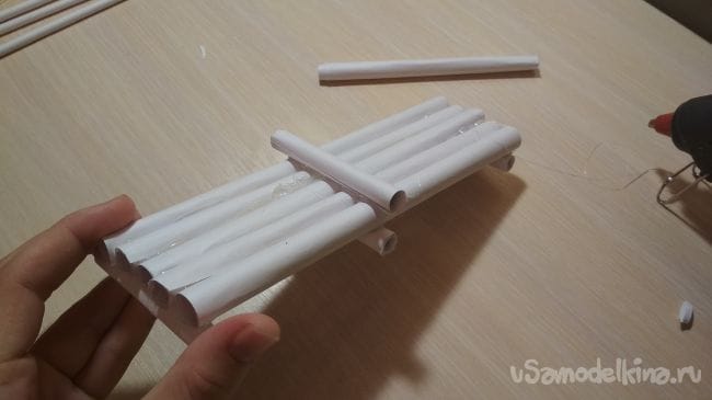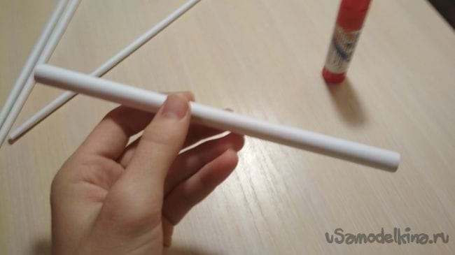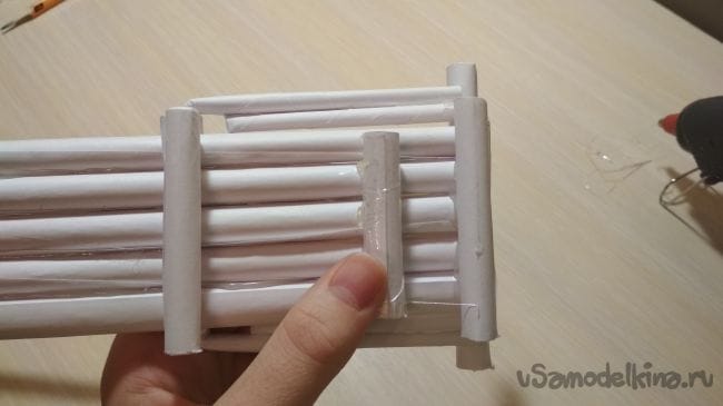 Берём отрезок толстой трубочки длиной 2-4 см и приклеиваем его рядом с крайней длинней толстой трубочкой на нашем основании: