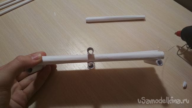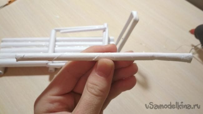 От оставшегося отрезка толстой трубочки отрезаем кусочек длиной 9-10 см, и приклеиваем его к концу нашей двигающийся части конструкции:
