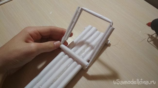 Приклеиваем к нашему основанию так, как показано на фото (тот отрезок трубочки который мы делали длиннее нужно приклеить с краю):