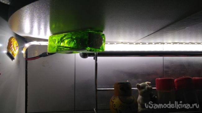 Далее коробку с датчиком закрепляю снизу на верхнем кухонном ящике и подключаю к питанию и ленте.