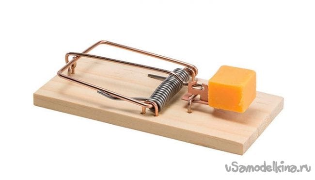 Мышеловка заряжена, любопытная мышка обязательно захочет исследовать норку, учует запах колбасы и нитки ее не остановят - враз перегрызет. Пружина резко потянет петлю - удавку и мышка окажется прижатой к потолку норки. Кот у меня молодой, с мышами сам справляется, унесу мышеловку соседке для тестирования и последующей эксплуатации.