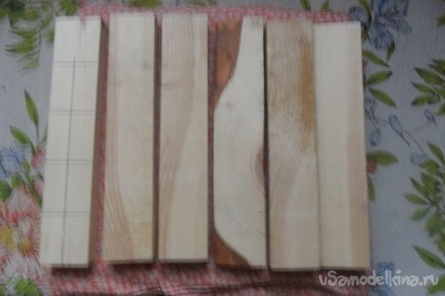 Рейку прострогал рубанком, разметил на 6 равных частей и распилил ручной ножовкой. Торцы распилов обработал наждачной шкуркой. Получилось 6 плашечек длиной 250, шириной 45 и толщиной 20 мм.
