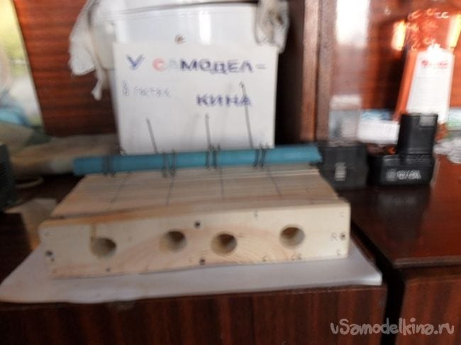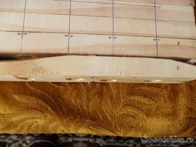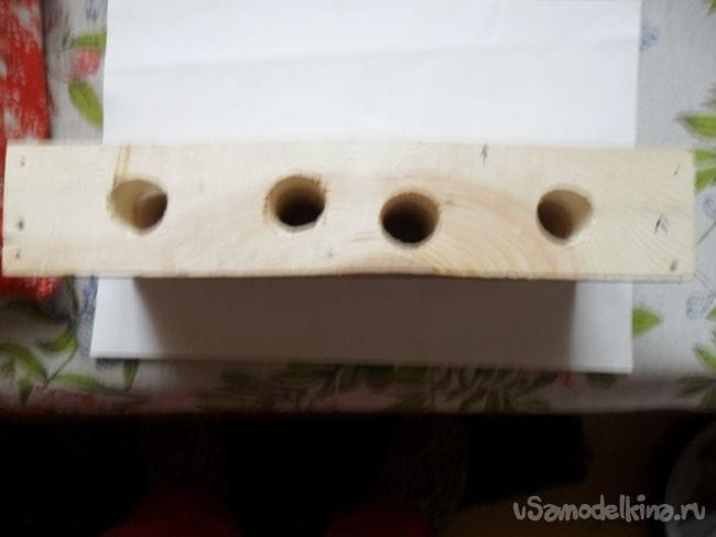Разметил 1 плашечку на 4 мышиные квартирки, четыре плашечки сколотил гвоздями, пятую, с разметкой, временно пришил к ним гвоздиками.