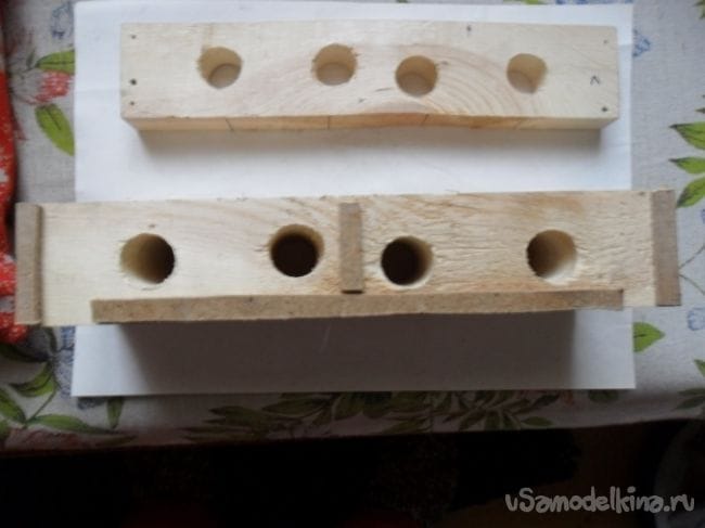 Коловоротом с перовым сверлом на 20 мм просверлил в плашечках 4 норки насквозь.