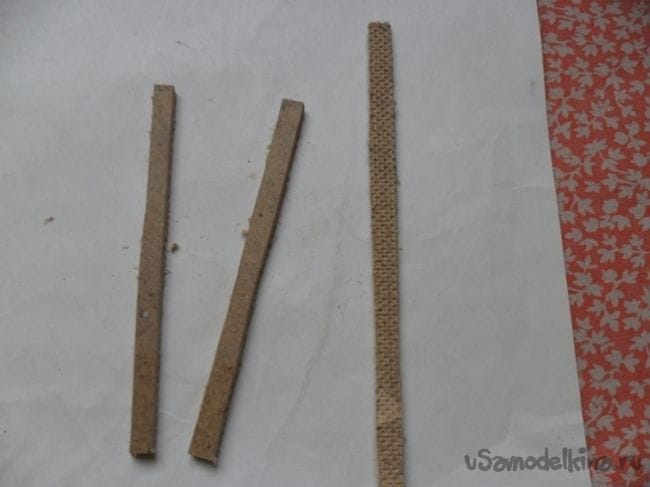 затем оторвал временно пришитую плашечку. Полоски разложил по краям, в середине и внизу сколоченных гвоздями плашечек,