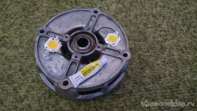 Потом приклеиваю их термоклеем на алюминиевый корпус от старого электродвигателя найденного в гараже. Это мне послужит радиатором и будет отводить тепло от светодиодных матриц.