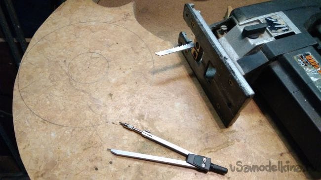Сначала на старой столешнице размечаю две окружности одна на 160 мм и внутри этой вторую окружность диаметром 50 мм.