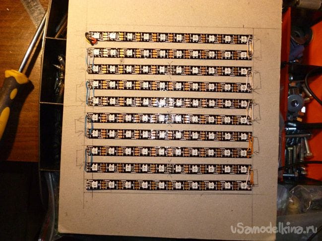Берем плотный картон и «разлинеиваем» его, то есть, чертим горизонтальные линии с расстоянием между ними 16мм. Отсчитываем 100 диодов от нашей ленты. Эти 100 диодов режим на отрезки по 10 диодов. Оставшиеся 20 режем по одному диоды. Делать это надо аккуратно и строго по линиям разреза. Поясню: 10 отрезков по 10 диодов итого 100 нужны для матрицы, оставшиеся 20 на заднюю подсветку. Отрезки по 10 диодов наклеиваем на картон по линиям. Обратите внимание на направление управляющего сигнала для диодов! Управляющий сигнал должен подаваться в правильно направлении, для этого на ленте стрелочкой показано направление. Первую полоску клеим слева – направо, то есть IN (вход) на ленте должен быть слева, а OUT (справа). Таким образов IN (вход) первой полоски должен находится в верхнем левом углу! Следующую полосу клеим наоборот, справа – налево. Третью опять слева – направо. Итак, далее. При следовании по направлению управляющего сигнала, у нас должна получиться зигзагообразная линия, начиная с верхнего левого угла. Главное ничего не перепутать.