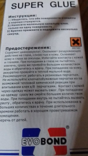 Вот эта инструкция. Особенно меня прикольнула строка текста, что пальцы и глаза слеивает за несколько секунд. Закрыл веки и усё. smile  Я то хоть и работал без перчаток, что частично является нарушением правил ТБ, но очки всёж-таки не забыл надеть. Зверский клей, говорю вам. Я им в данном случае клеил пьезокерамический излучатель к абсолютно гладкому  корпусу. Через 3 резинки. Намертво приклеилось. goodgood