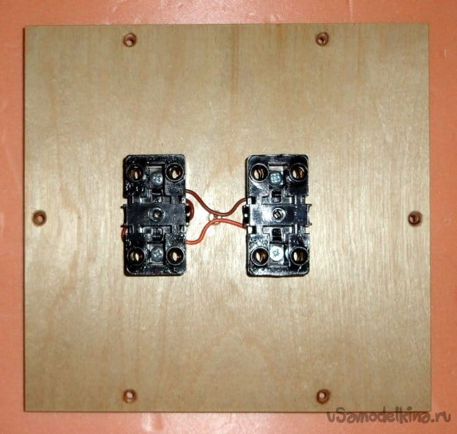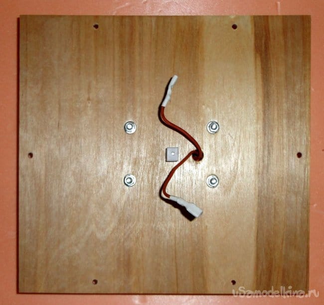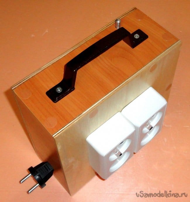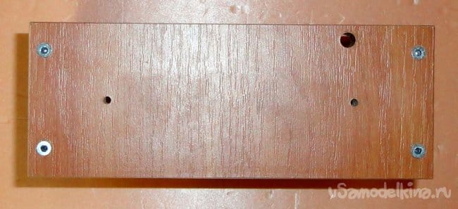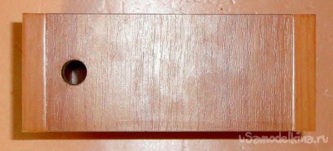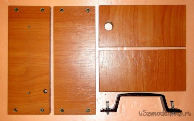Вырезанные из ЛДСП детали размерами 210х80х16мм – 2шт, 168х80х16мм – 2шт, с отверстиями и ручка. Внутренняя поверхность отверстий для провода и кнопки обработаны лаком.