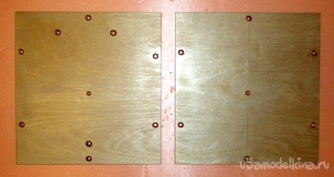 Вырезанные из фанеры детали размерами 210х200х6мм с отверстиями. Фанера зашлифована и обработана лаком.