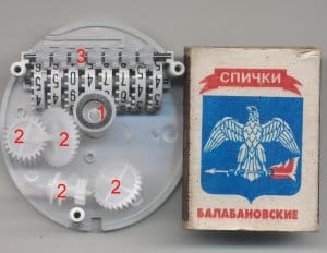 1 Многополюсный магнит. 2 Шестерёнка. 3 Счётчик механический многоразрядный без кнопки сброса.