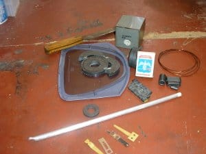 Две сетевых вилки с негодных шнуров, старый патрон с лампочкой 230 В 60 Вт, цоколь E27, розетка, паркетная дощечка, изолента и крепёж.