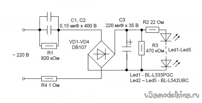 Приехав домой я решил, что буду ставить 4 синих светодиода BL-L542UBC и один зелёный BL-L333PGC для подсветки маленького коралла. Проработав схему, я приступил к делу.
