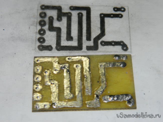 Проявляется рисунок обычной каустической содой (1,5 чайной ложки на 1 л воды, а можно взять 30 мл обыкновенного «Крота» для промывки труб на 400 мл воды — уходят считанные секунды). А после «дедовским методом», предварительно промыв тщательно плату, травить в хлорном железе. Потом пролудил плату и распаял все детали.