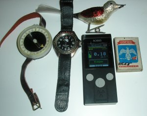На фото ниже я показываю момент проверки некоторых своих вещей дозиметром-радиометром. Это компас со светящимися стрелками, командирские часы со светящимися стрелками (которые уже не светятся, что как раз подозрительно), старая немецкая ёлочная игрушка. Как видим, прибор показывает, что радиационный фон в норме.