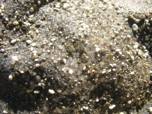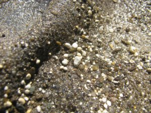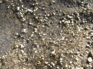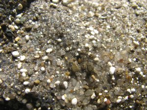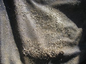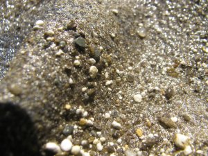 Далее на 15-18 метрах мы вошли в мелкий желтый, а потом и серый песок. Поглощение на нем было очень слабое, поэтому решили идти далее. Примерно с 20 метра вошли в какую-то серую породу, интернет подсказал, что это серая/черная глина или бетонит.