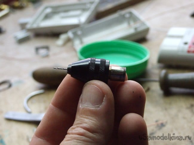 Место сверления «накернил» шилом. Глухое отверстие в пластиковом приливе внутри корпуса датчика сделал сверлом Ø1.0 мм зажатым в трехкулачковый сверлильный мини-патрон (Фото 7). Сам же мини-патрон вставил в шуруповерт (Фото 8).
