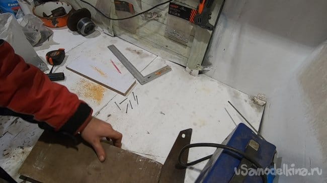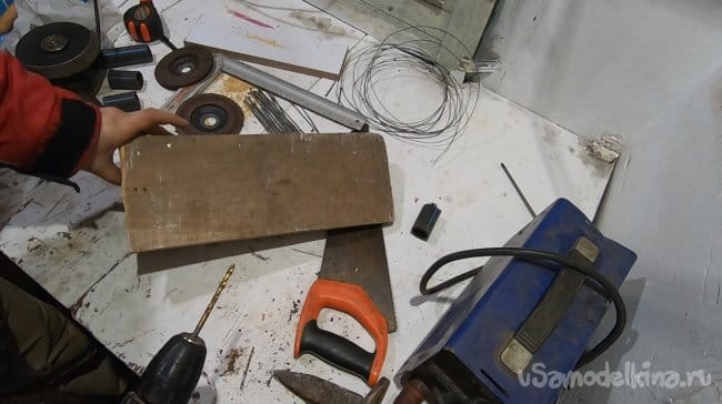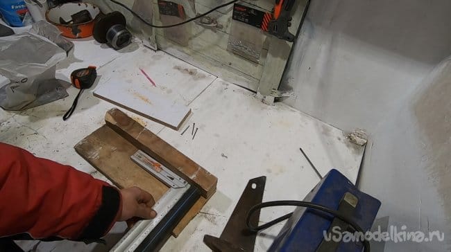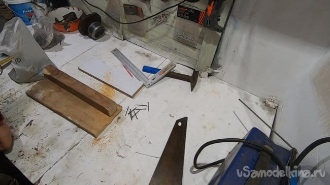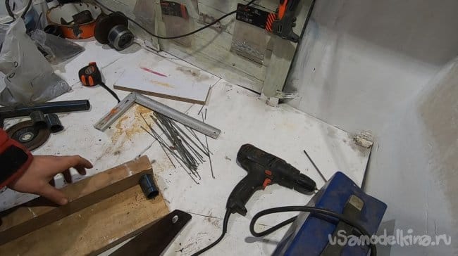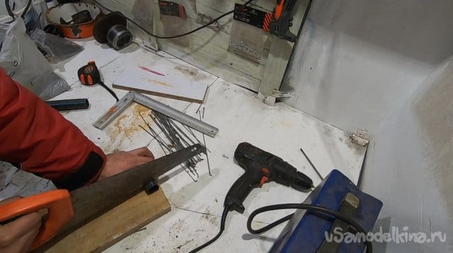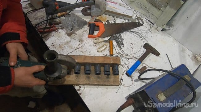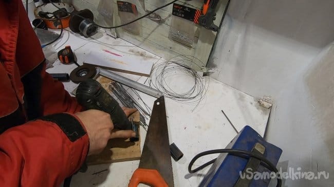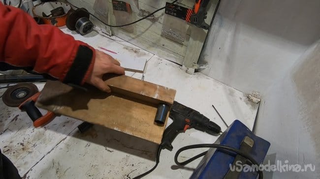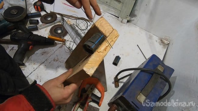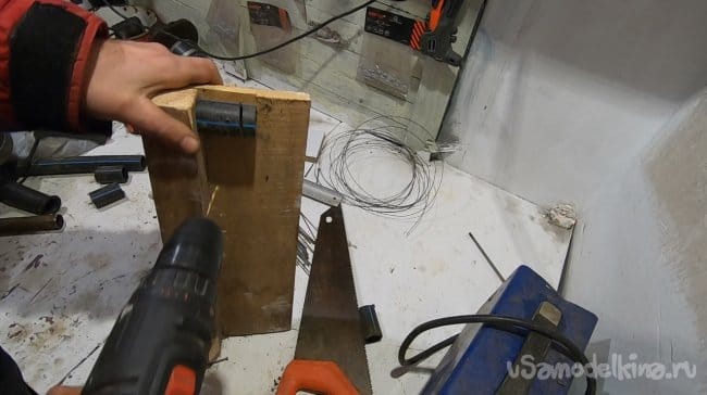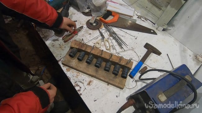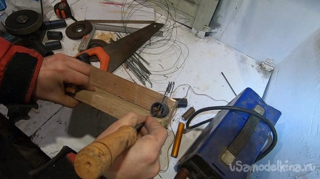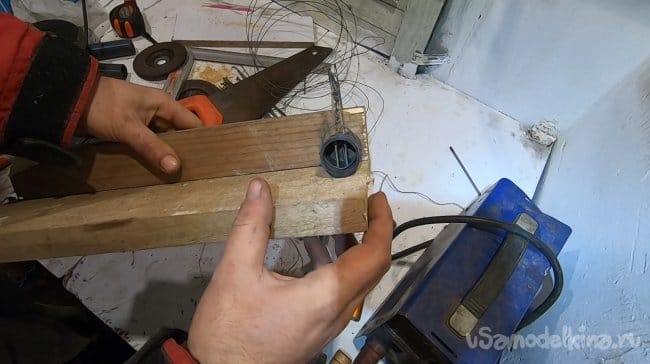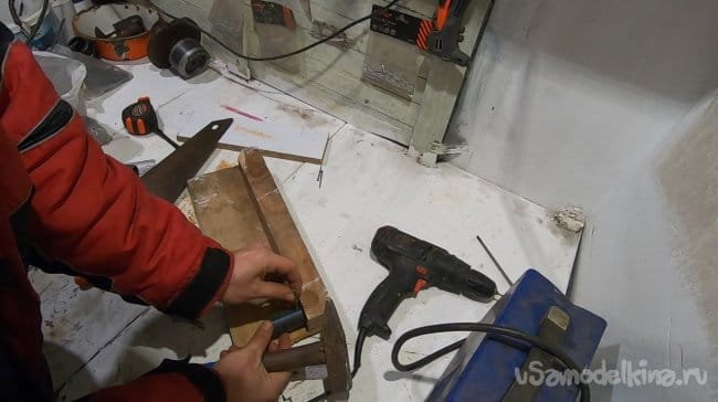 По длине я на глаз нарезал трубы длиной около 5 см, резать можно ножовкой, но быстрее всего болгаркой. Ну а далее сверлим отверстия и прибиваем трубу к основанию гвоздиком. Чтобы трубка не крутилась, плотно упираемся ей в брусок. При желании можно закрепить еще и спереди, но как по мне, оно и так держится отлично.