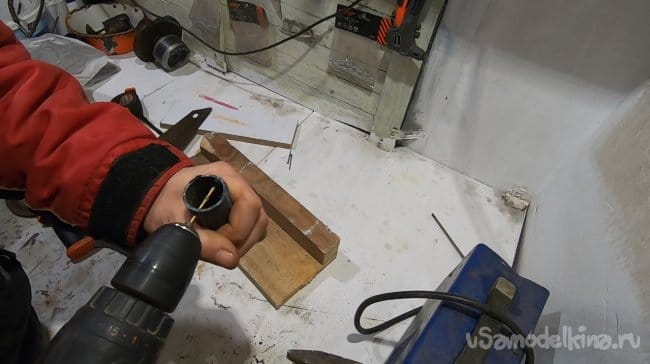 В оригинальной конструкции отверстия сверлятся прямо в бруске, но перьевого сверла у меня не было, делать я его не захотел, поэтому и решил сделать из трубы, обрезков трубы на 32 мм у меня полно. Такой размер оптимален для мышей по размеру, им там не тесно и они туда с радостью залазят.
