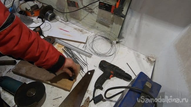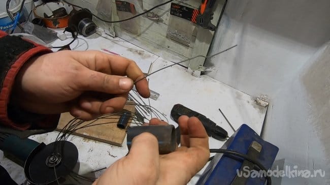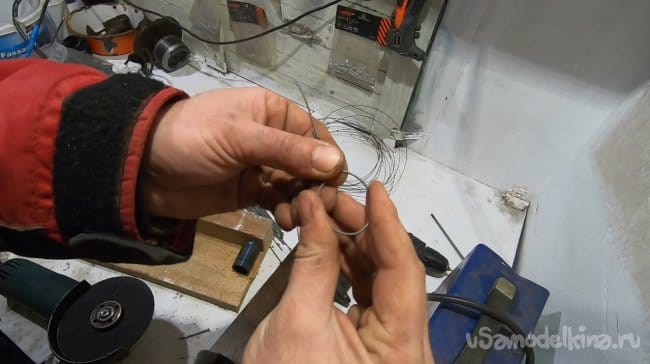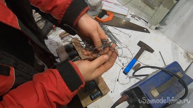 Чтобы упростить продевание веревки, я сделал специальную иголку из проволоки с крюком на конце.