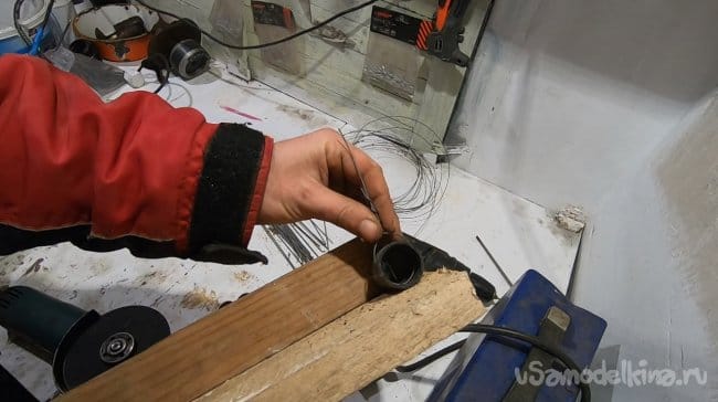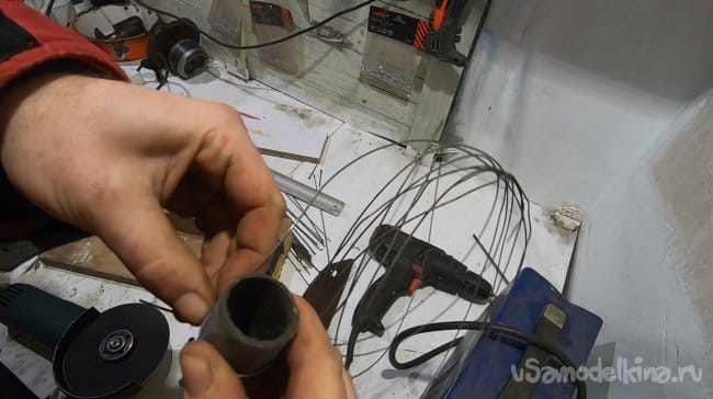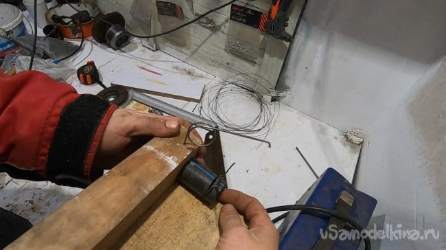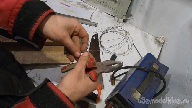Делаем петлю, которая будет хватать мышь за шею… ну или на что будет настроена ловушка. Петли я делал на той же трубе 32 мм из мягкой стальной проволоки. Петля получается великовата, но это не страшно, просто немного сплющиваем ее, чтобы она превратилась в овал.