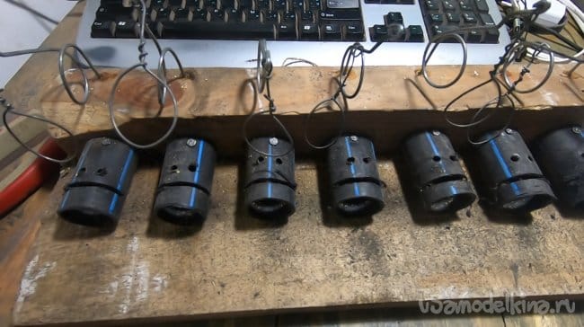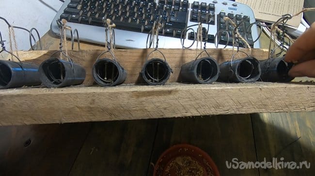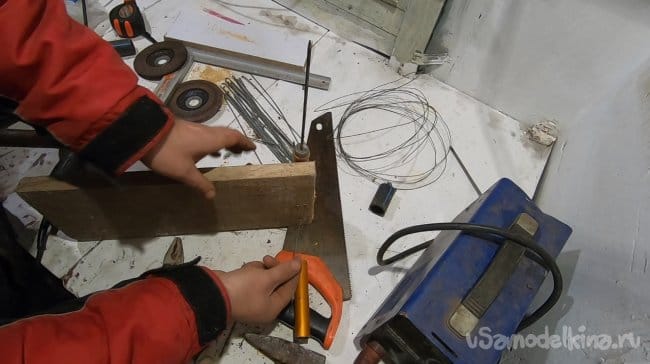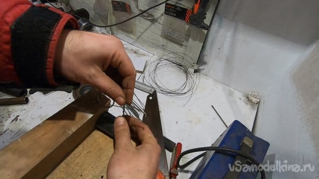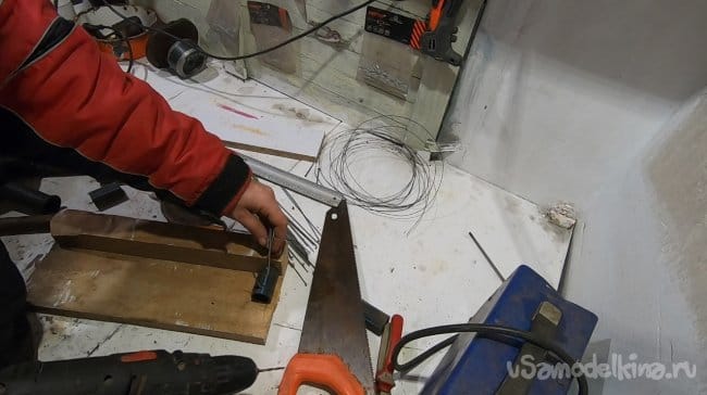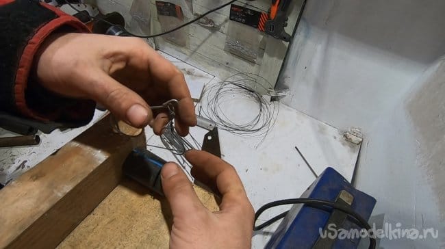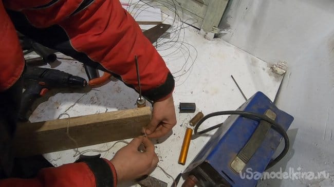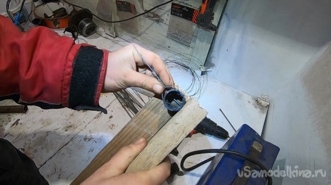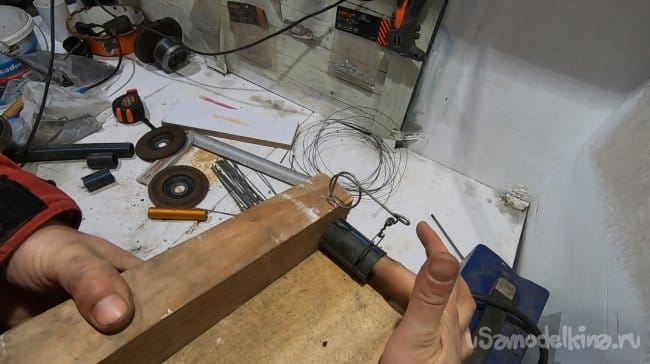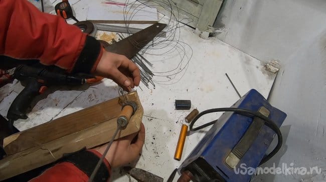 Пружины я делал из велосипедных спиц, просто сгибаем их петлю на трубе, я использовал кусок трубы от карниза. На конце пружины делаем петлю и устанавливаем туда нашу петлю-душилку. Под пружину в бруске в нужном месте сверлим отверстие.