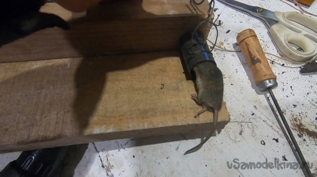 Мышеловку я начал делать вечером, пришел утром в мастерскую, а проказница уже на месте. Петля схватила мышь четко за горло.