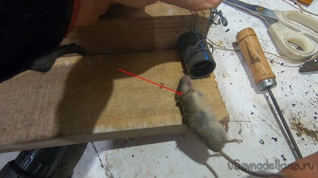 Немного отступив от пропила, сверлим отверстия под веревку. Мышь будет залазить в норку, перегрызет на пути приманки веревку, тем самым приведет в действие свой приговор. Отверстия нужно просверлить так, чтоб петля схватила мышь за горло (самая гуманная смерть). Диаметр можно выбрать миллиметра три, для удобного продевания веревки.