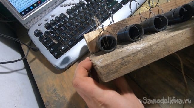 Первым делом изготовим основание, на котором и закрепим трубы. Для этого нужно прибить брусок к доске, брусок можно заменить и просто двумя досками. Брусок нужен для того, чтобы перекрыть один торец трубы, а еще он служит для труб упором, чтобы они не крутились.