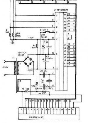 Микросхема КР1016ВИ1 имеет два напряжения питания -27В для индикации и -12В для памяти и вычислений и может быть аварийно запитана только от последнего маломощного источника. Индикация при этом не работает, но все настройки и ход часов сохраняются. При отключениях регулярных и длительных, имеет смысл применить резервную батарею или аккумулятор, при кратковременных же сбоях, справляется простой конденсатор заметной  емкости. Кроме прочего, это избавит и от забот по размещению батареи, контролю за ее состоянием. Практика коллег в аналогичных случаях показала, стандартной емкости конденсатора в 2200 мкФ, довольно для сохранения настроек микросхемы КР1016ВИ1 в течении 3…5 мин. Схема доработки может быть такой (Рис. 9).