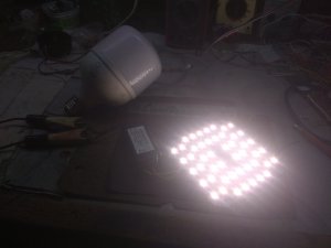 Поставил лампу в гардеробную, включил — освещения в гардеробной хватает с лихвой! Судя по спектру, стоят светодиоды с тепловой температурой 4600-5000К.