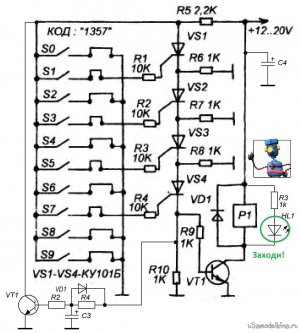 Код -- тумблерами? Ну, ты оригинал, однако... Код обычно набирается десятипозиционными переключателями. Но если попроще - пойдёт!  smile