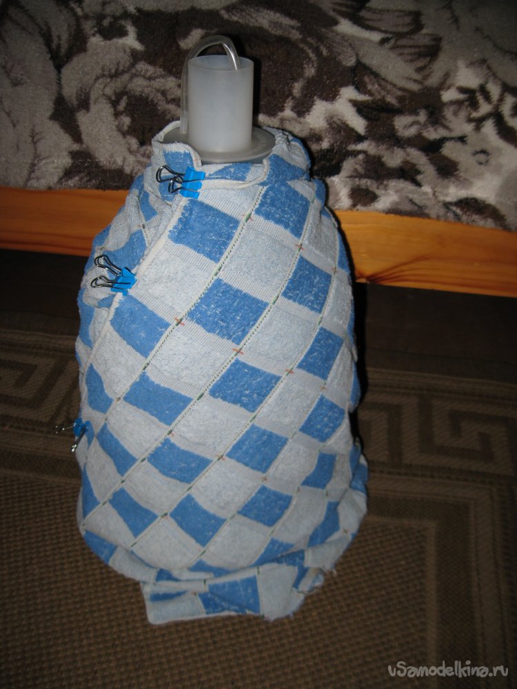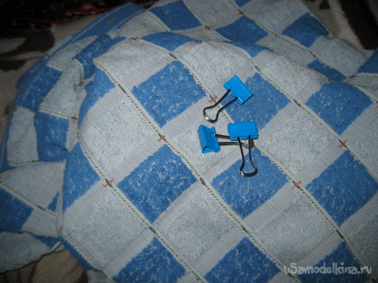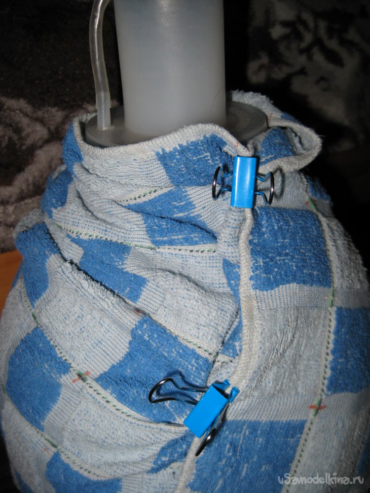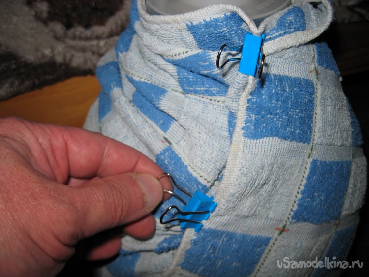 Для того чтобы закрепить полотенце на емкости, используем канцелярские зажимы.
