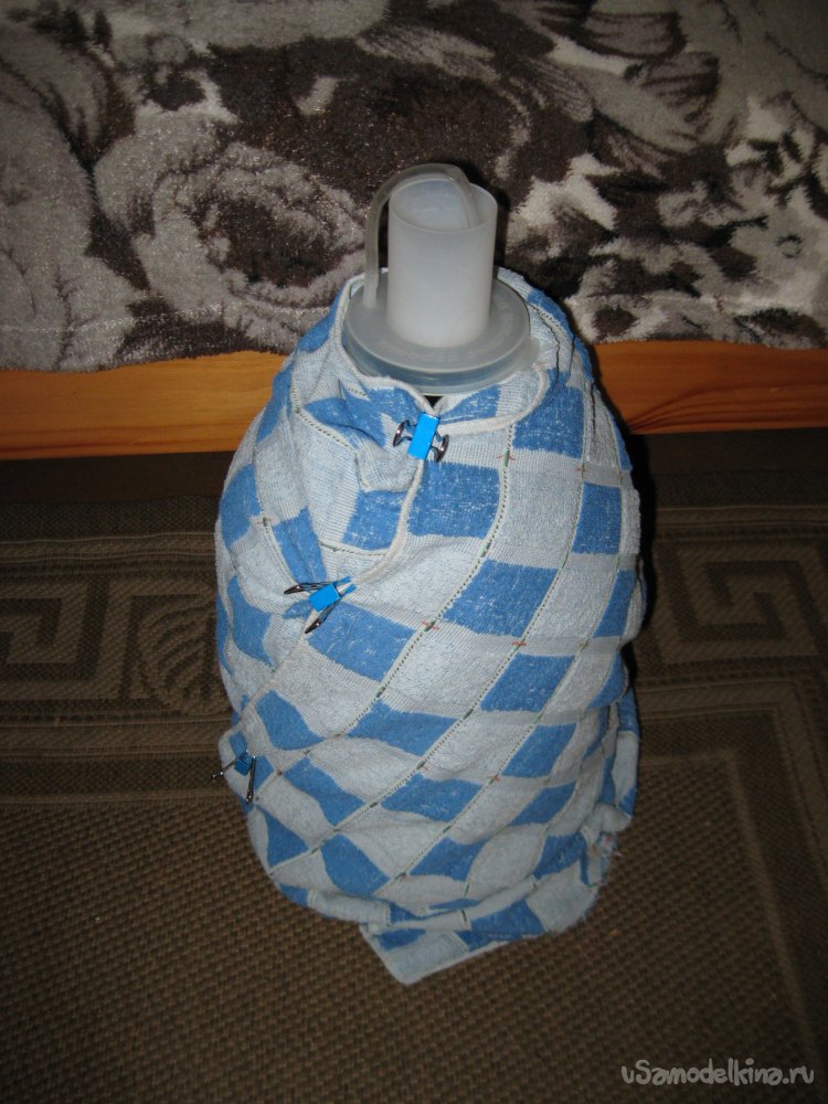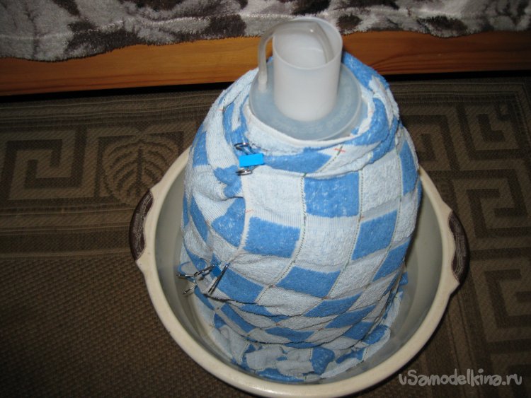 Затем нужно смочить полотенце водой и слегка отжать. После чего, им нужно плотно обернуть емкость с бродящим суслом, например, стеклянную бутыль.