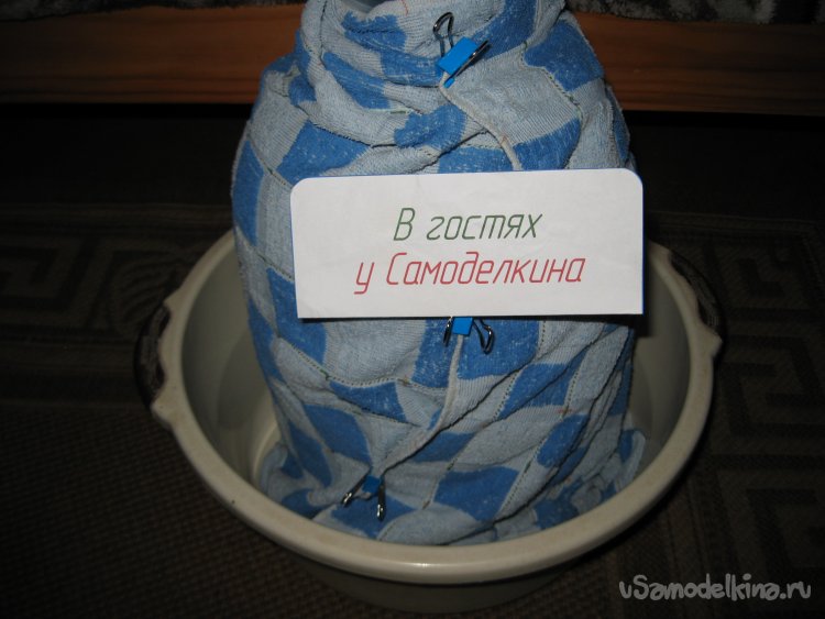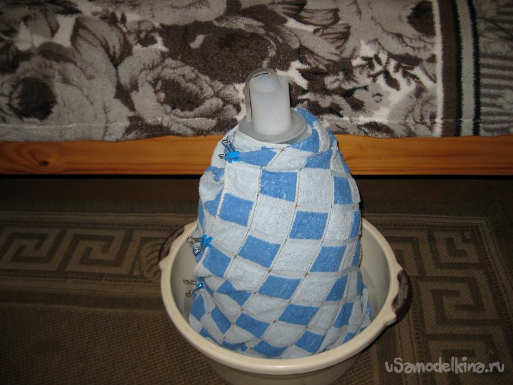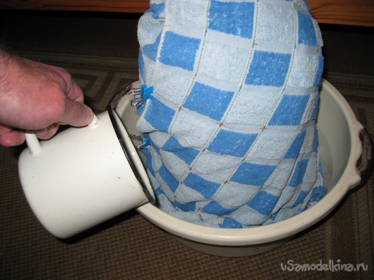 При этом нужно особенно следить за тем, чтобы нижние концы полотенца были опущены в воду, а лучше, доставали до самого дна тазика.