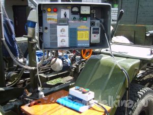 Пульт управления с джойстиком. Все работает от 220 вольт. Есть автономная электростанция на 6 кВт. Установлено взаимозаменяемые электродвигатели на 2.2 кВт- три штуки. И еще три разной мощности и размерами (лебедка, вентилятор охлаждения лебедки, дозатор подачи бурения).
