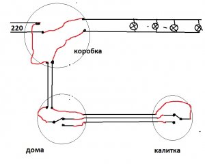 От коробки до выключателя - двужилка. А трёхжилка ушла на калитку. Соответственно, и вернулась фаза в выключатель, и уже в нём соединилась  с тем проводом, что ушёл в коробку.