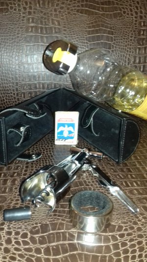 goodgood friends А я вот недавно прикупил себе довольно брутальный штопор. Я помнится, писал, что сломал штопор в Новогодние праздники при открытии бутылки вина. Этим новым я легко открыл бутылку вина хорошего и крепкого, особенностью которого является то, что из-за содержания сахара и выдержки, пробка очень хорошо прилипает и держится в бутылке. Несколько штопоров сломал ранее при открытии таких вин. Этот штопор изготовлен явно не из силумина, в комплекте идёт чехол  с ремешками и защелками, защитный колпачёк на спираль штопора. 2 дополнительные насадки. Мы с дружбаном не могли понять, для чего они... Инструкция не прилагалась. xaxa Потом я понял, одна из приспособ как раз для откручивания любых, самых трудных крышек с баклажек и бутылок ПЭТ и не только. Уже опробовал в деле. Откручу что по резьбе, что против. Легко. Эта штуковина видна вверху фотки. Но пока не понял, для чего приспособа в виде кольца приличного диаметра с мягким материалом внутри scratch