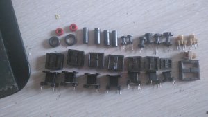 Из представленных на фото материалов рекомендую выбрать Ш-образный ферритовый магнитопровод с наибольшим размером (из тех, что на снимке). Проще мотать или перемотать, если что-то не так получилось. Челнок не нужен для этого, как если бы мотать на кольце. Про тонкие диэлектрические прокладки (зазор) не забывай при сборке такого сердечника.
