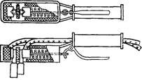 На рис. 2 изображен электрододержатель для сварки трехфазной дугой, предназначенный для крепления в нем двойного электрода.