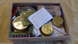А кроме этого, в этом пайке есть пакетик с 3 таблетками сухого горючего с маленьким раскладным казанком для разогревания пищи. Упаковка из 6 водо-ветроустойчивых спичек с тёркой для поджига. Все баночки с продуктами запечатаны толстенной алюминиевой фольгой, внутри банок тоже серебристая фольга, а снаружи золотистого цвета. Сама коробка пайкА тоже внутри в фольге.