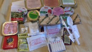 Шпик солёный, причём не такой, о который можно зубы сломать, а очень нежный, на хлеб можно мазать. Тушёное мясо говядина, курятина с овощами, рисом. Разные овощи, повидло яблочное, кофе, чай, сахар, сухие сливки, соки. Просто заливаешь обычной холодной водой, размешиваешь и готово. И это совсем не та гадость, что продавалась массово лет 15 назад. Как там рекламе показывали "просто добавь воды..." Я продолжу...