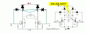 Сначала к выходу Н-моста я подключил вольтметр. Можно видеть, как меняется полярность на выходе, когда подаю сигнал на точки «А» и «В». Затем подключил слабенький электромотор, на шестерне я нарисовал синею точку. Видно как меняется направление вращения шестерни. Ну и в конце взял электромотор с редуктором от дрели, 15 В, 1,2 А. Все прекрасно работает. Главное не перегружать допустимые параметры. Данная сборка рассчитана до 10 А. При запуске электродвигателя происходит скачек по Амперам в два, или в три раза. Это вы можете видеть на видео. При более серьезных нагрузках, полевые транзисторы и тиристоры можно собрать в сборки, или подобрать более мощные.