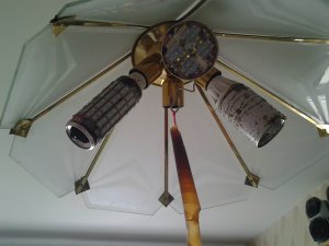 Вот в дальней комнате свет. Используетца 1 лампочка и от выключателя на стене. Проверял индикатором - все норм. Выключатель отключает фазу. Когда снял эту свою люстру для доделки, там под колпачком провод Алюмень для люстры свернут в кольцо. Ха,. а он под напряжением. И без разницы в каком положении выкл. на стене. Это мой датчик определил (предостерег!). Вот что это за эквилибр строителей из прошлого?