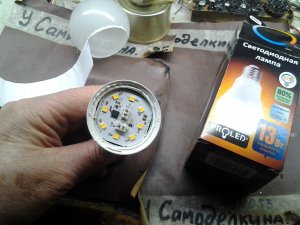 Стандартный цоколь, 8 корпусов, на каждом падает примерно 32 В при 24 мА. Черный 6-ногий паучок, выполняющий ф-ии выпрямителя и, судя по всему, генератора тока. Конд. 3.3*400 внизу. Полезн. мощ. получается 32 В * 8 *24 мА =... smiles А написано 13 Вт. И цвет не тянет на 4000°, ближе к 6000.